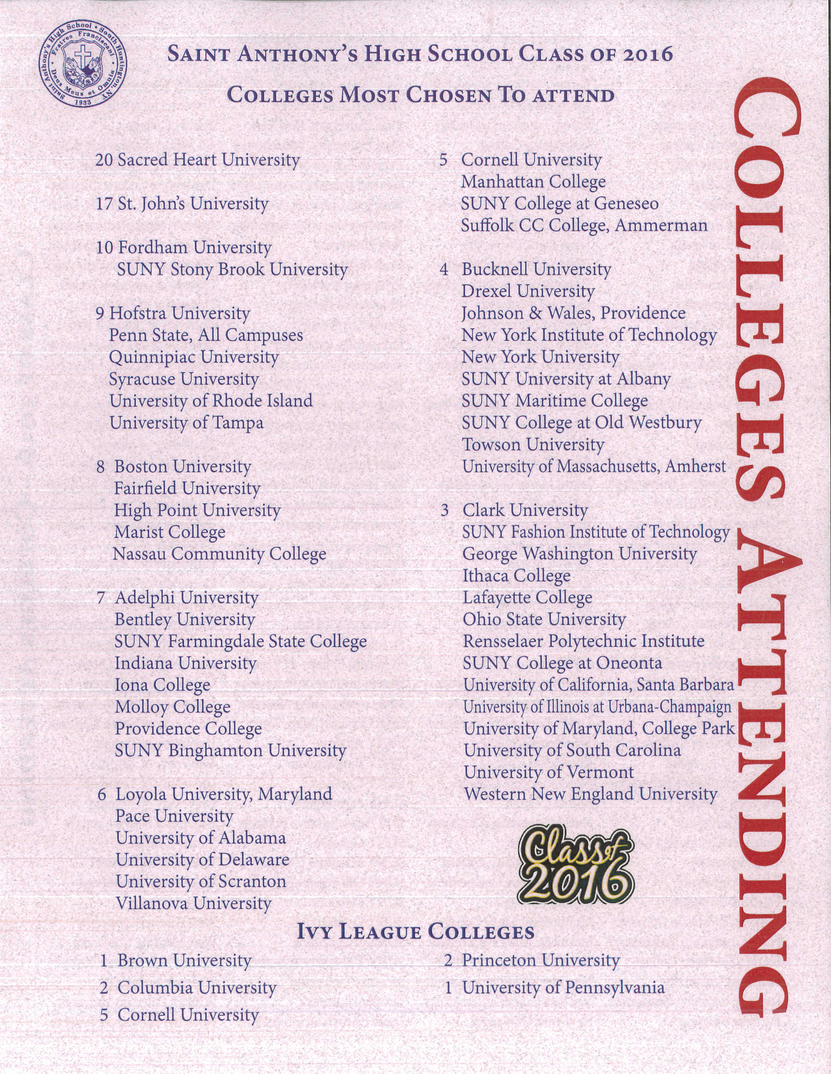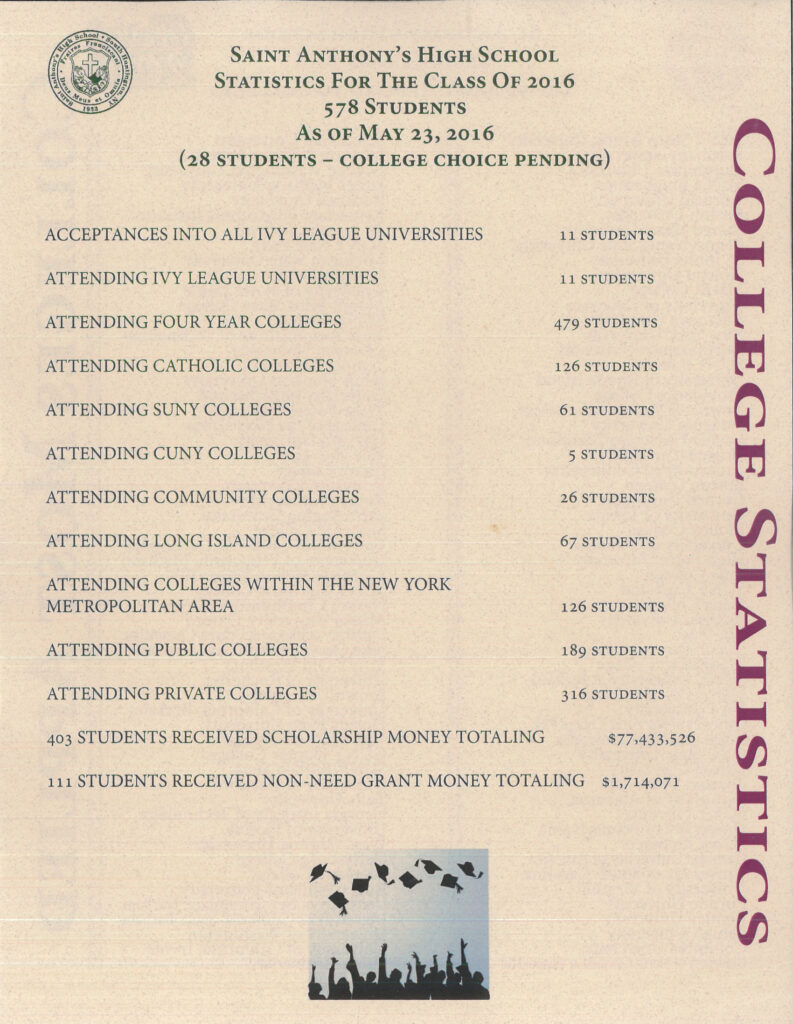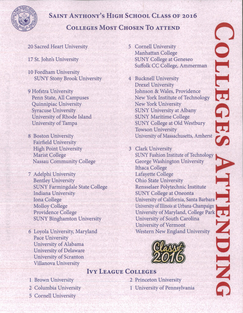 Saint Anthony's proudly offers a robust curriculum consisting of Regents and Honors-Level Classes, twenty-four Advanced Placement Courses and ninety-six Electives. In addition, we partner with local colleges and universities to afford our students the opportunity to earn college credit.