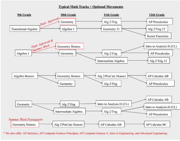 Based on the student’s score on the Math section of the entrance exam, students will either be recommended for Integrated Algebra or Transitional Algebra. Since schools may not disclose specific test results to students of their families, students and families who visit the Math table at either Accepted Student Open House or Incoming Freshman Course Selection day will simply be told that they are either recommended for Integrated Algebra or Transitional Algebra.